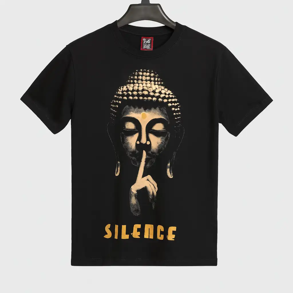 Color: The classic black color beautifully complements the serene Buddha graphic, creating a striking yet stylish look. The gold-accented “SILENCE” text adds a touch of elegance, making this t-shirt perfect for casual outings, home wear, or spiritual gatherings. Its color combination ensures a versatile style that fits any wardrobe.