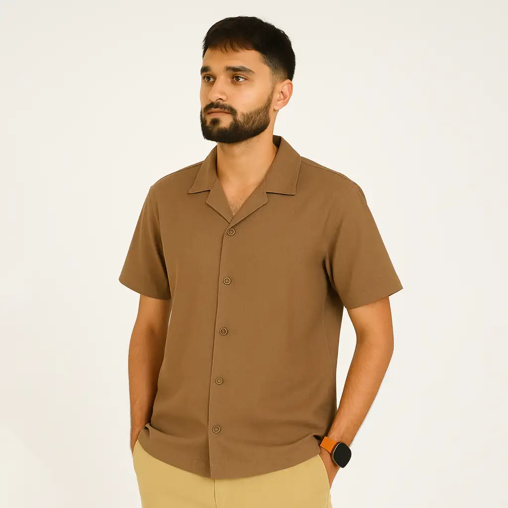 Color and Fabric: The shirt comes in a light, neutral shade, featuring an Cedar Brown collar that adds a subtle touch of contrast. Made from breathable linen, it keeps you cool and comfortable throughout the day.