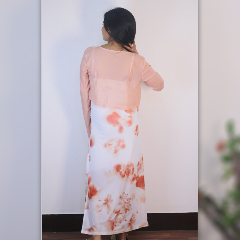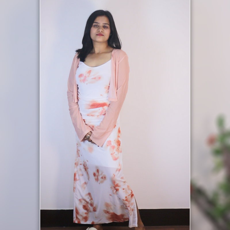 Cute, this soft white maxi dress with orange watercolor prints, paired beautifully with a light-weight shrug. A flowy silhouette perfect for brunch, casual wear or any laid-back occasions.